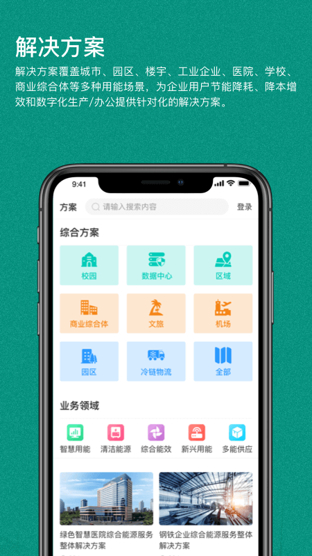 解决方案覆盖城市、园区、楼宇、工业企业、医院、学校、商业综合体等用能场景,为企业用户节能降耗、降本增效、数字化生产/办公提供针对性的解决方案。