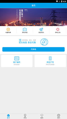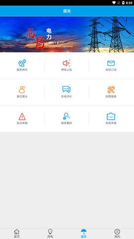 1.进入软件后,可以看到一些常用的功能,如用电、用电应用、服务网点等。