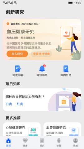 华为创新研究app是一款专注于健康的软件,用户可以在软件内浏览各类最新的健康资讯,了解健康方面的小知识,并通过与智能设备连接及时了解用户自己的健康状况,感兴趣的话快去下载吧!