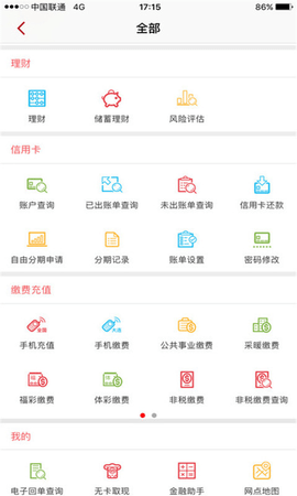 4.信用卡:账户信息查询、积分查询、信用卡还款、信用卡存款、免费分期付款申请等