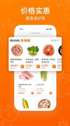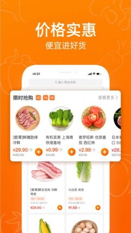 2、覆盖水果蔬菜、肉禽水产、酒饮乳品、粮油百货、餐厨调味等全品类食材。