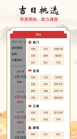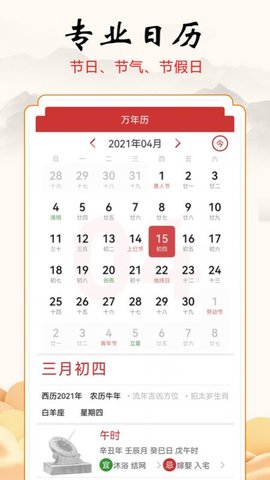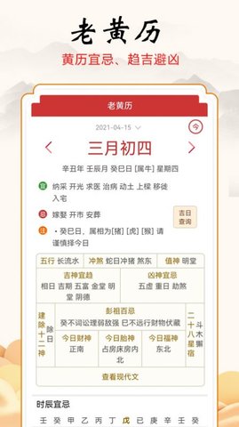 1、软件中有一个传统的黄色日历,它会提醒用户在这一天做什么和不做什么。