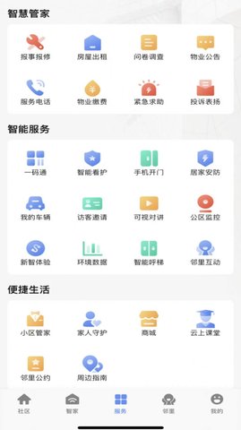 3、一键式专属、一站式物业服务、个人中心、便捷的家居服务、智能通知。
