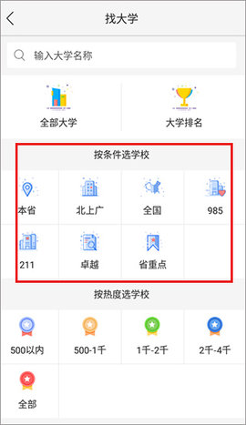 1、用户可以根据自己的专业选择学校,也可以根据成绩选择,专业目录选择,都是很好的筛选类型