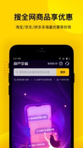 1、葫芦全省是一款查找大额优惠券、购买全额返现红包的应用。