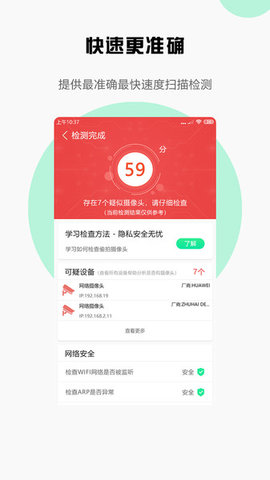 2、单击一键安全检测并等待片刻,以了解当前WiFi网络下是否有在线偷拍摄像头。