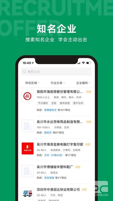 吴川招聘网APP是一款方便的在线招聘服务。丰富的职业岗位让您可以自由选择,找到您喜欢的岗位,知名企业覆盖广泛的行业,自由选择岗位让您有更好的选择,快来下载试试吧!