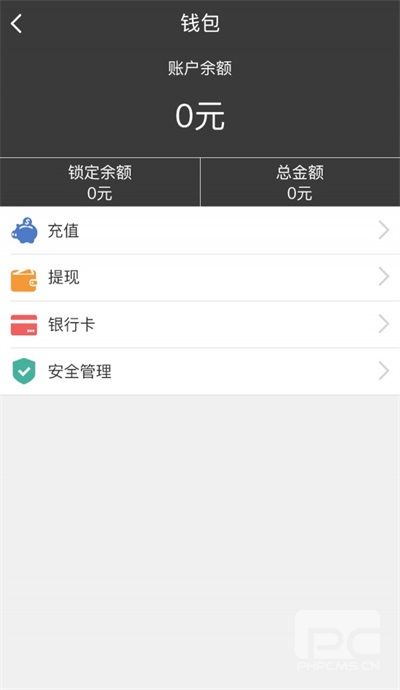 1、钱包包含充值、提现、银行卡、安全管理等选项,可查看账户余额、锁定余额、总额等相关信息。