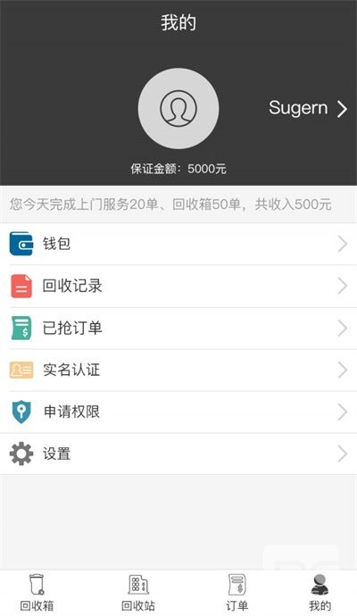 2、我的钱包、回收记录、抓取订单、实名认证、权限申请、设置等选项,可以查看保额、上门服务号、回收箱号、总收入元数等相关信息。