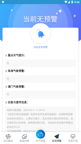 3、最新、最快的灾害性天气预警信号,让您及时了解珠海即将或正在进行的灾害性天气过程的基本信息和防御指引