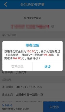 5、打开处罚决定明细,查看违法事件、违法地点、费用明细,快速支付。