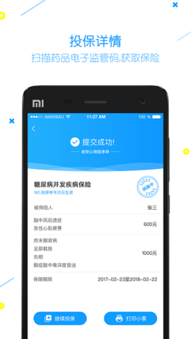 2、药物保障:协助用户投保,显示保险明细,打印保险凭证