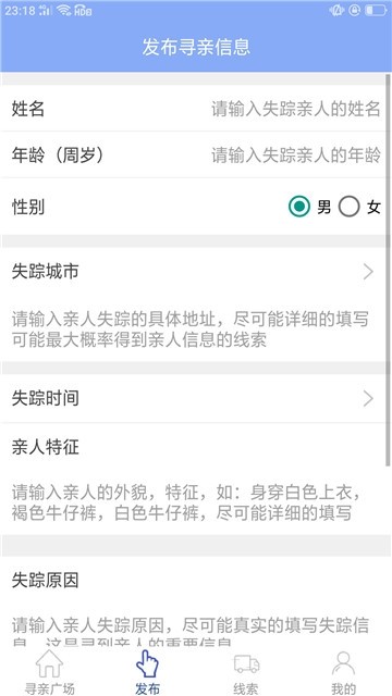 太阳寻人启事是一款非常方便的生活服务类软件,只需要输入手机号就可以注册账户,在平台上发布寻人启事,你可以将走失人员的年龄、名字、性别还有特征和走失地点都发布在平台上,让平台上的用户可以随时留意周边有没有走失的人员提供线索,太阳寻人安卓版下载后可以直接在平台上提交线索给走失人员的家人。