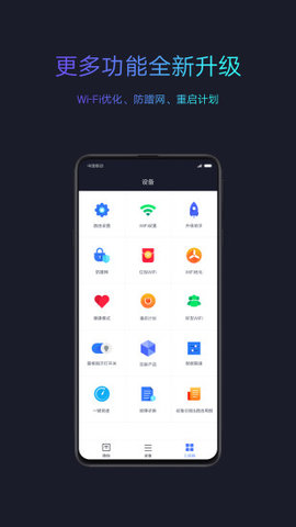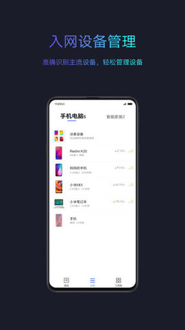 1、设备管理:随时随地管理联网设备,状态一目了然。您可以设置任何设备的网络访问权限、数据访问权限、智能带宽分配和昵称。