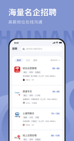 人在海南app是一个求职平台,该软件汇集了海南许多优质的企业和公司,为用户提供了大量的就业机会,用户可以随时找到工作,各种各样的工作都可以在这里看到,用户都可以找到自己的工作