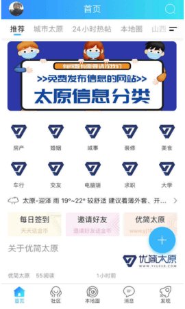 最新版优简太原是非常实用的生活服务,收录了太原的最新资讯,用户可以免费查询和搜索,非常方便,同时,24小时热帖,百万太原在线热帖聊天,等你加入,多种旅游信息和指南带您到太原。
