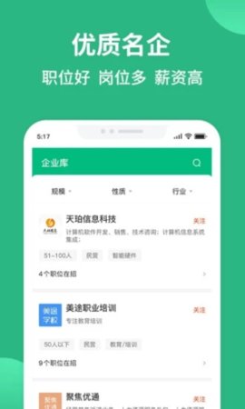 4、求职者可以使用搜索功能快速找到自己喜欢的公司类型,并为您的搜索提供相关资源。