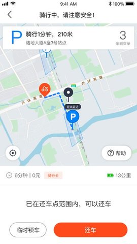4、要在线退车,请在应用程序上查看离你最近的站点,将车停在指定站点的白线内,然后在应用程序中单击“我想还车”以成功结束订单。