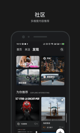 1、优化后的摩托车导航功能,可以找到专为骑行者打造的加油站、智能工具和社交app,升级圈和发布者的显示效果,缓解长期滑动带来的视觉疲劳