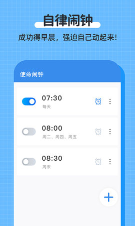 自律使命闹钟是一款移动闹钟,可以帮助你养成良好的工作和休息习惯。其中有许多不同类型的工作和休息模板。如果你想有规律地工作和休息,但没有好的方法,自律任务闹钟可以帮你。它可以帮助用户更加自律地完成一些任务。