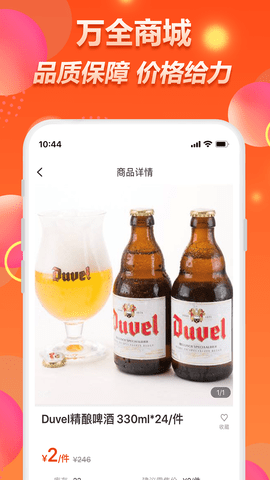 1、万全商城app是万全网络旗下的B2B交易平台,平台利用互联网技术,为传统渠道店(BC超市、小型便利店、水果店、小型餐厅)和特殊渠道(单位)提供快消品、生鲜产品的一站式线上订购业务。