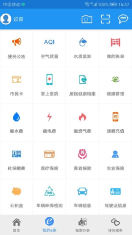 2、信息查询:主要包括公示、空气质量、水费缴费、电费缴费、水质检测、我的账单、市民卡、医疗保险、养老保险、失业保险、公积金、手持式医院、居民健康档案、健康管理、电话费充值、社保缴费、气费缴费、车辆环境检测、车辆信息、驾照信息、车辆违规、企业查询、职称查询、工资发放等功能。
