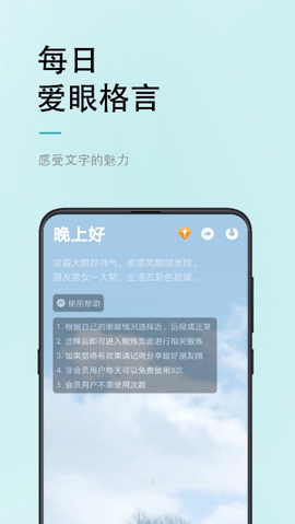 3、这款应用程序有助于预防眼部问题,提高意识,并养成眼部护理习惯。提供约10种眼视训练方案,放松和加强眼肌,改善眼血循环,减少眼疲劳,改善视力。