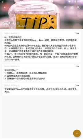 盒子笔记app是一款功能非常强大的笔记软件,享受这款很不错的掌上笔记软件,通过这款软件你可以轻松的记录你的生活信息,软件功能十分的丰富,整个界面也是非常的整洁完全不会有任何广告出现,带给你超好的用户体验,需要的用户可以下载试试!