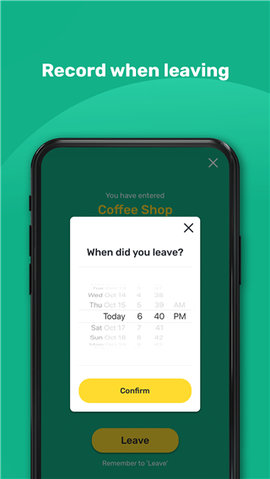 2、离开时,按下app中的离开键,相关的旅行记录将被加密存储在您的移动设备上