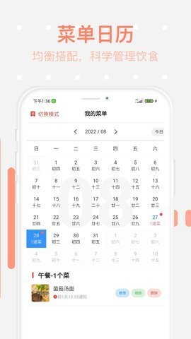 1、菜单计划有列表模式和日历模式。在列表模式下,会根据菜单计划按时间排序,让用户一目了然。在日历模式下,您可以在日历中查看过去和未来的菜单计划,更方便用户使用。您可以修改、删除和添加自己的食谱