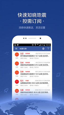 3、地震讯息实时推送最新的地震通知,以便您能够首次获得最新的全球地震消息。