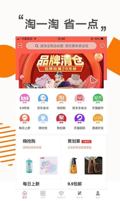 1.淘省点app精选商品,低价超值,9块9包邮还返利!。