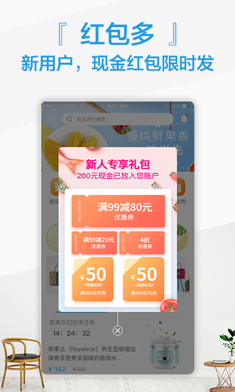 2.新用户现金红包在限定的时间内发出,邀请朋友立即获得购物资金。