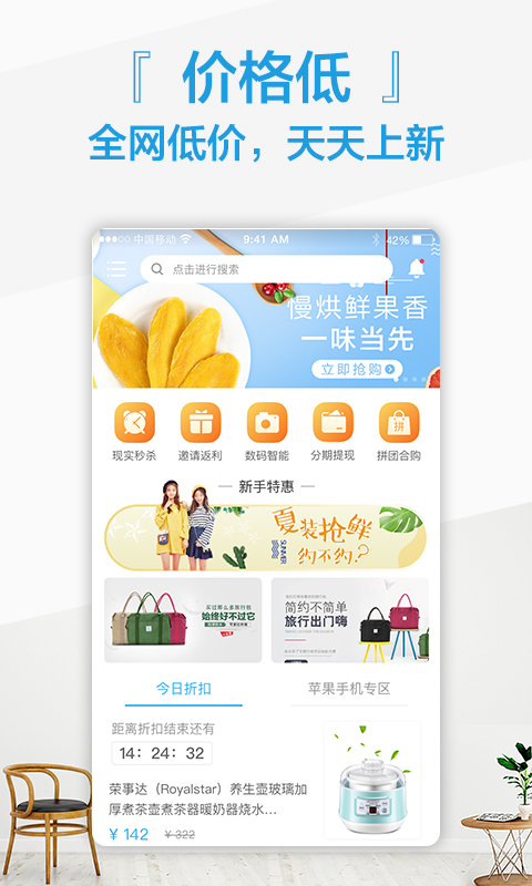 小鱼优品app将为您选择高成本,高品质的产品,包括中国银行的正品,质量保证,全网低廉的价格,独家折扣以及热销的特殊产品等着您,小鱼优品下载安装之后可以以超低的价格购买高品质的商品,还有更多的团体活动等着您参加,有那么多好东西等着您来发现,还有各种各样供您选择的高质量产品,各种高质量的单一产品,为了满足您的所有购物需求,致力于为用户提供高质量的购物体验,有需要的用户欢迎来yn下载站下载使用。