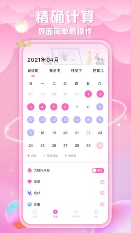 2、不仅可以记录月经,还可以准备怀孕、排卵期记录,