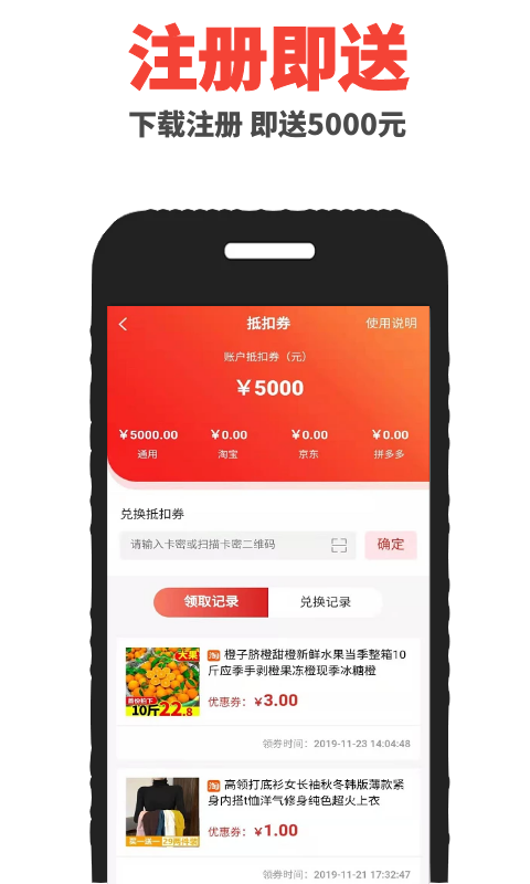 新人用户下载注册软件,就送5000元现金奖励,让你不花一分钱,就可轻松开启你的线上购物之旅,体验超优惠的购物快感。