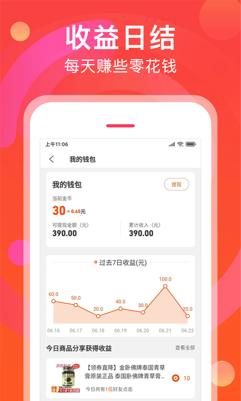 用户还可通过将商品分享给好友,好友下单后,用户就可轻松领取商品收益,赚取零花钱,收益每天日结,用户可放心,完全无需担心收益的结算问题。