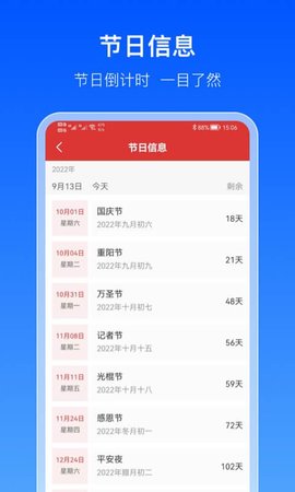 1、节日信息,节日倒计时,一目了然,节日信息非常全面,可以及时查看。