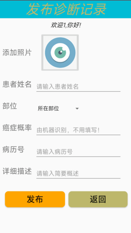 1、通过拍照或选择相册的方式获得皮肤病的照片,患者可以对皮肤病的病情进行一定的描述。