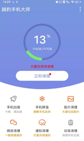 2、越豹手机大师APP可以帮助用户选择和处理手机中的各种大文件信息,以及各种无用的通知拦截相关功能,这些也可以在软件中完成。
