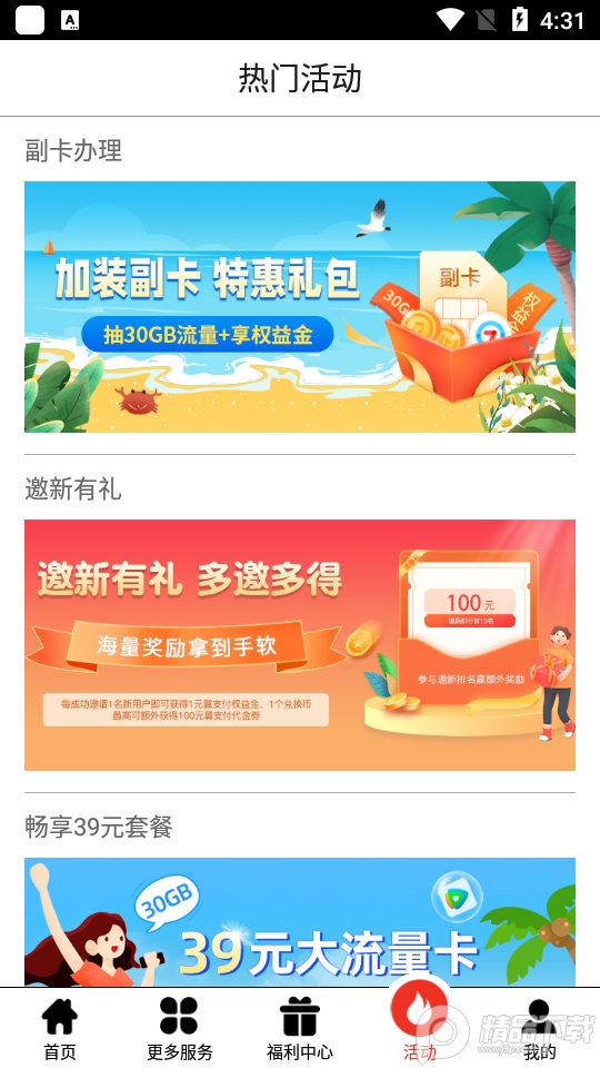 3、接下来是活动页面。众所周知,运营商不时提供非常优惠的套餐和活动。用户可以在这里找到一些流行的活动来参与