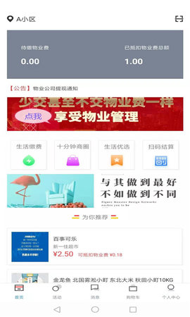 1、支付成本,只需与社区绑定,用户即可支付物业费、电费等生活费用,为用户节省时间。