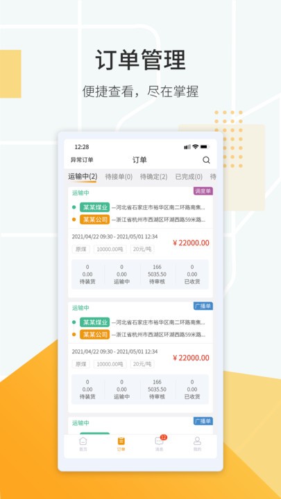 1、满易运货主端这里订单列表中可以查看全部订单的最新状态,帮助你找到靠谱的送货司机。