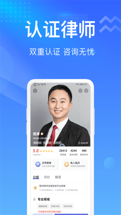 想问律师是专业的法律服务软件。能在线提供专业的法律解答服务,通过提供法律有关的阅读内容,带来全领域的专业法律服务。就可以选择对应的咨询相关的内容,发布打官司、援助热线、律师介入、代写文书。为您提供债权纠纷、民事纠纷、离婚析产等不同的服务,想问律师可以上拥有各种有关法律,简单使用这里的专业法律条文。