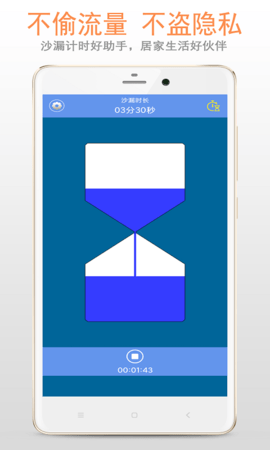 1、提供沙漏计时的中心功用,包括流利逼真的沙漏旋转、落沙动画、时间设置和计时等。