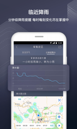3、实时降雨预告:预测将来的降雨量。分钟级别晓得什么时分下雨,什么时分停。