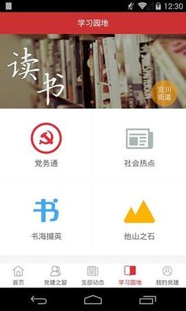 1、学习平台:“学习花园”为用户提供党务、图书、电子书、社会热点、山石等信息。