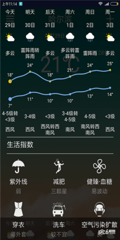 3、生活指数信息:化装、洗车、穿衣、UV、运动等生活指数,合理布置生活出行。