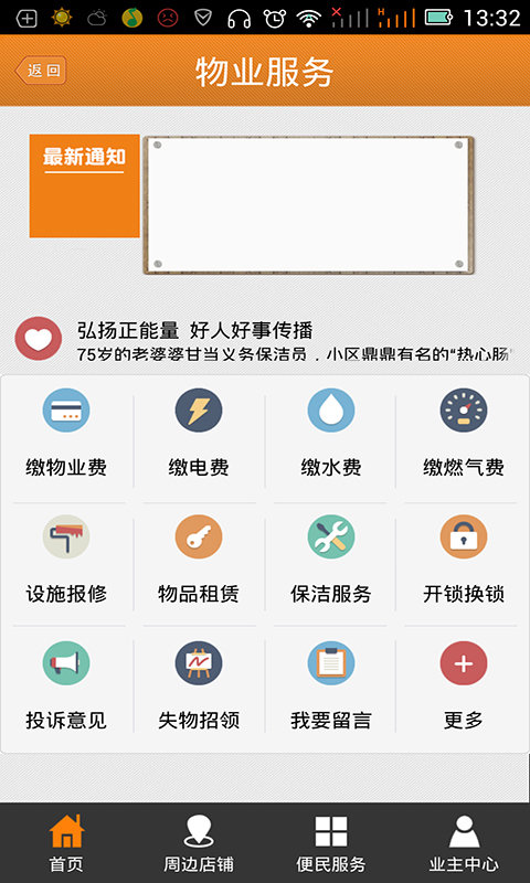 7、小区公告:物业可发布停水、停电、电梯停运通知、失物招领、小区求助、社团招募等。