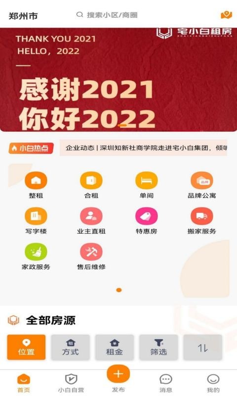 2、宅小白租房提供合租、整租、公寓、集中式等多种房源类型,随时在平台分享你的生活经验。